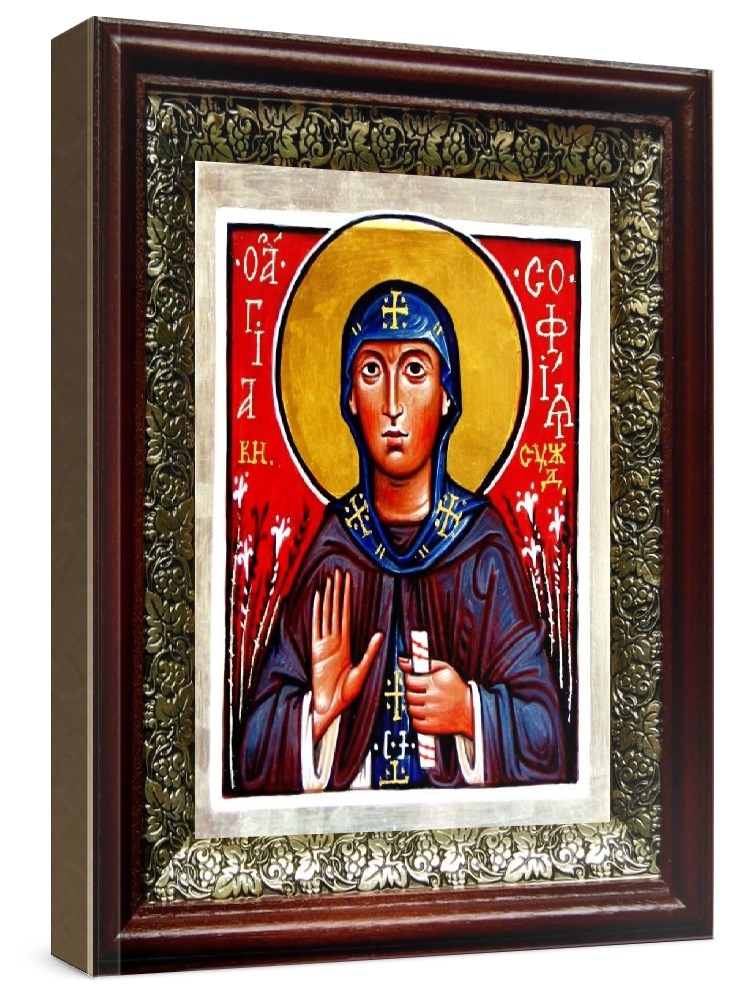 Икона софия суздальская (19х22), темный киот. Лик нанесен методом шелкографии на цельную липовую доску, покрытую левкасом (специальным грунтом под живопись). Использованы минеральные (природные) краски. Размер иконы без киота (см): 13х16, с киотом: 19х22. Киот со стеклом, выполнен из березы и украшен басмой (узор из черненой меди в виде виноградной лозы). Икона освящена.