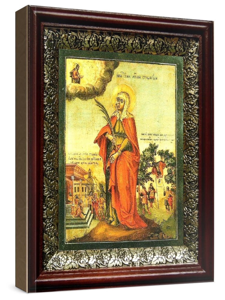 Икона стефанида дамасская (19х22), темный киот. Лик нанесен методом шелкографии на цельную липовую доску, покрытую левкасом (специальным грунтом под живопись). Использованы минеральные (природные) краски. Размер иконы без киота (см): 13х16, с киотом: 19х22. Киот со стеклом, выполнен из березы и украшен басмой (узор из черненой меди в виде виноградной лозы). Икона освящена.