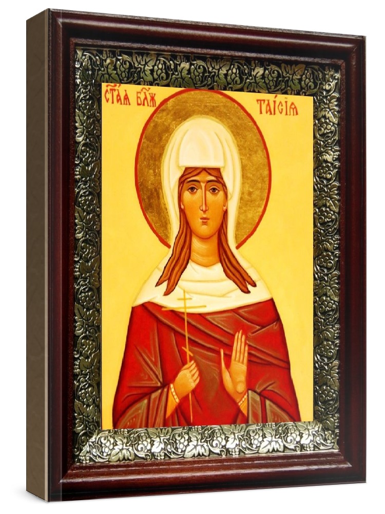Икона таисия египетская (19х22), темный киот. Лик нанесен методом шелкографии на цельную липовую доску, покрытую левкасом (специальным грунтом под живопись). Использованы минеральные (природные) краски. Размер иконы без киота (см): 13х16, с киотом: 19х22. Киот со стеклом, выполнен из березы и украшен басмой (узор из черненой меди в виде виноградной лозы). Икона освящена.