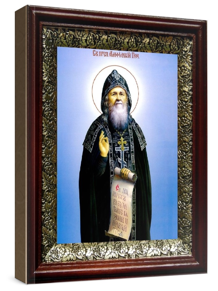 Икона амфилохий почаевский (19х22), темный киот. Лик нанесен методом шелкографии на цельную липовую доску, покрытую левкасом (специальным грунтом под живопись). Использованы минеральные (природные) краски. Размер иконы без киота (см): 13х16, с киотом: 19х22. Киот со стеклом, выполнен из березы и украшен басмой (узор из черненой меди в виде виноградной лозы). Икона освящена.