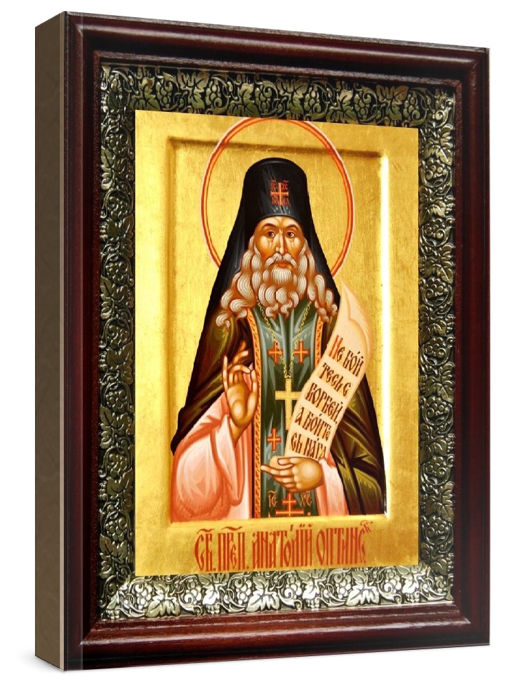 Икона анатолий оптинский (19х22), темный киот. Лик нанесен методом шелкографии на цельную липовую доску, покрытую левкасом (специальным грунтом под живопись). Использованы минеральные (природные) краски. Размер иконы без киота (см): 13х16, с киотом: 19х22. Киот со стеклом, выполнен из березы и украшен басмой (узор из черненой меди в виде виноградной лозы). Икона освящена.