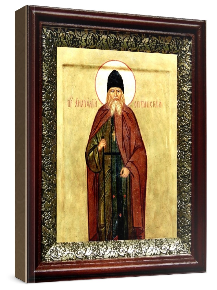 Икона анатолий оптинский (19х22), темный киот. Лик нанесен методом шелкографии на цельную липовую доску, покрытую левкасом (специальным грунтом под живопись). Использованы минеральные (природные) краски. Размер иконы без киота (см): 13х16, с киотом: 19х22. Киот со стеклом, выполнен из березы и украшен басмой (узор из черненой меди в виде виноградной лозы). Икона освящена.