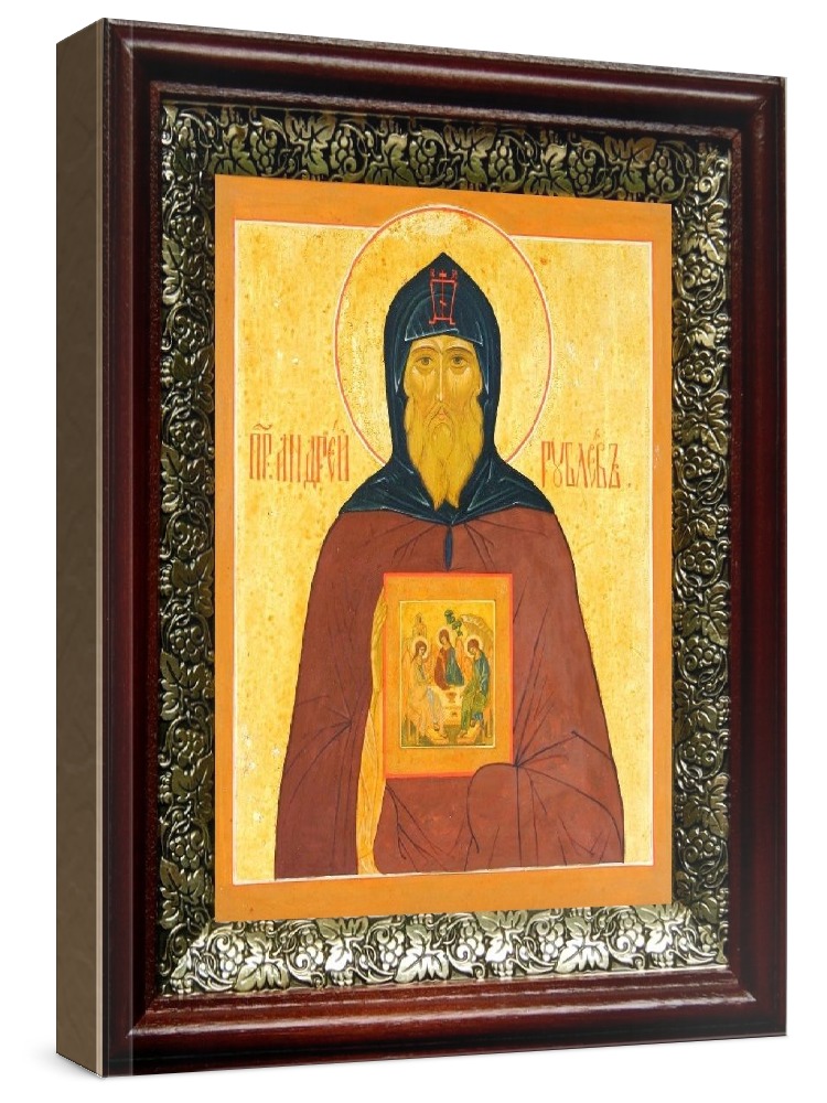 Икона андрей рублев (19х22), темный киот. Лик нанесен методом шелкографии на цельную липовую доску, покрытую левкасом (специальным грунтом под живопись). Использованы минеральные (природные) краски. Размер иконы без киота (см): 13х16, с киотом: 19х22. Киот со стеклом, выполнен из березы и украшен басмой (узор из черненой меди в виде виноградной лозы). Икона освящена.