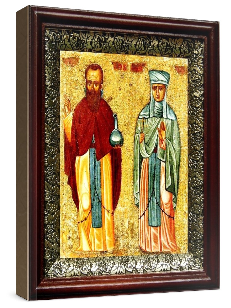 Икона андроник антиохийский и афанасия (19х22), темный киот. Лик нанесен методом шелкографии на цельную липовую доску, покрытую левкасом (специальным грунтом под живопись). Использованы минеральные (природные) краски. Размер иконы без киота (см): 13х16, с киотом: 19х22. Киот со стеклом, выполнен из березы и украшен басмой (узор из черненой меди в виде виноградной лозы). Икона освящена.