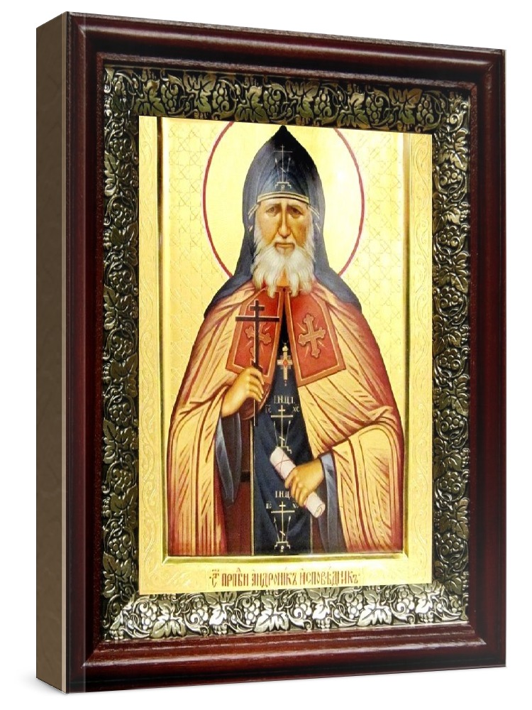Икона андроник глинский (19х22), темный киот. Лик нанесен методом шелкографии на цельную липовую доску, покрытую левкасом (специальным грунтом под живопись). Использованы минеральные (природные) краски. Размер иконы без киота (см): 13х16, с киотом: 19х22. Киот со стеклом, выполнен из березы и украшен басмой (узор из черненой меди в виде виноградной лозы). Икона освящена.