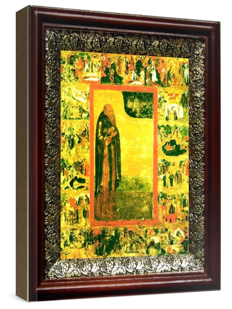 Икона антоний сийский (19х22), темный киот. Лик нанесен методом шелкографии на цельную липовую доску, покрытую левкасом (специальным грунтом под живопись). Использованы минеральные (природные) краски. Размер иконы без киота (см): 13х16, с киотом: 19х22. Киот со стеклом, выполнен из березы и украшен басмой (узор из черненой меди в виде виноградной лозы). Икона освящена.