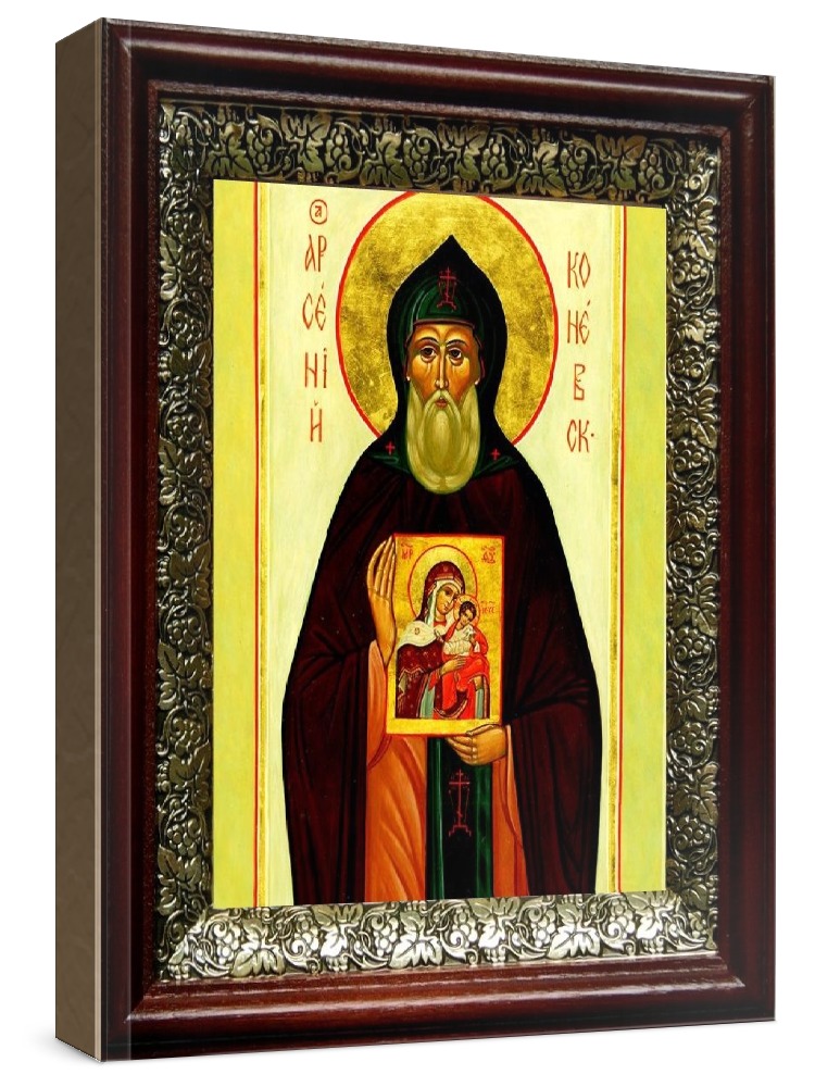 Икона арсений коневский (19х22), темный киот. Лик нанесен методом шелкографии на цельную липовую доску, покрытую левкасом (специальным грунтом под живопись). Использованы минеральные (природные) краски. Размер иконы без киота (см): 13х16, с киотом: 19х22. Киот со стеклом, выполнен из березы и украшен басмой (узор из черненой меди в виде виноградной лозы). Икона освящена.