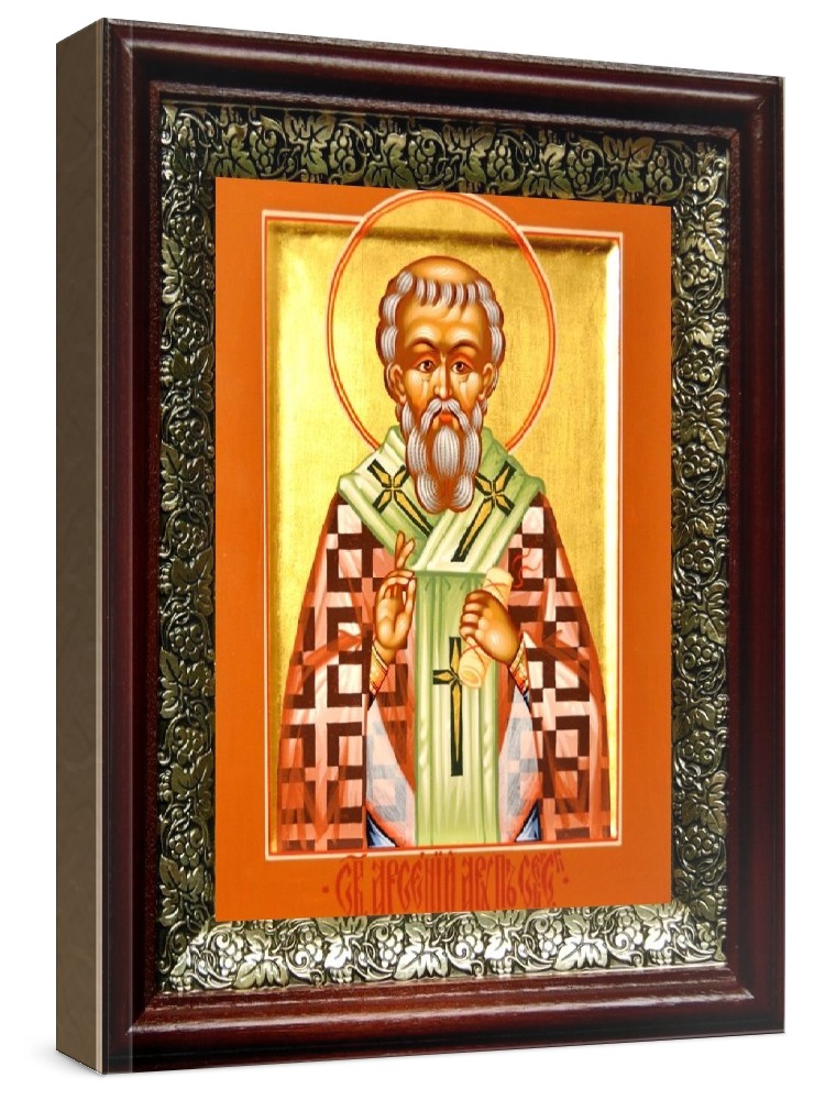 Икона арсений сербский (19х22), темный киот. Лик нанесен методом шелкографии на цельную липовую доску, покрытую левкасом (специальным грунтом под живопись). Использованы минеральные (природные) краски. Размер иконы без киота (см): 13х16, с киотом: 19х22. Киот со стеклом, выполнен из березы и украшен басмой (узор из черненой меди в виде виноградной лозы). Икона освящена.