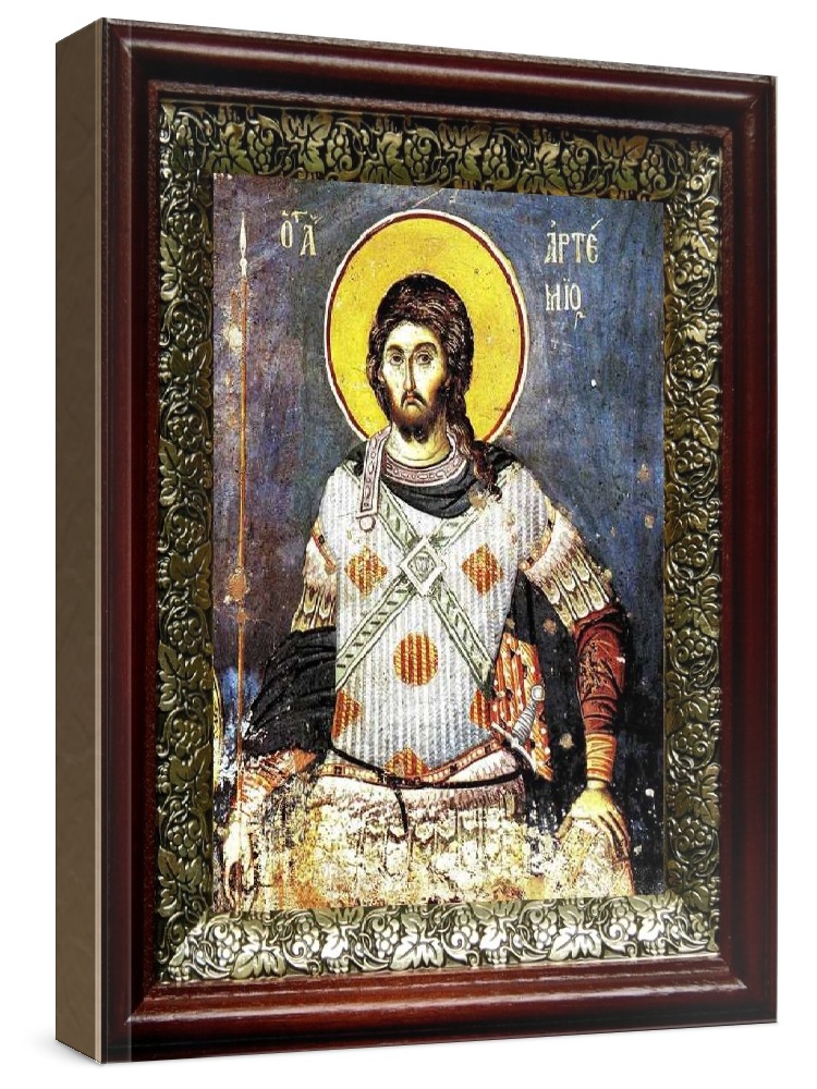 Икона артемий антиохийский (19х22), темный киот. Лик нанесен методом шелкографии на цельную липовую доску, покрытую левкасом (специальным грунтом под живопись). Использованы минеральные (природные) краски. Размер иконы без киота (см): 13х16, с киотом: 19х22. Киот со стеклом, выполнен из березы и украшен басмой (узор из черненой меди в виде виноградной лозы). Икона освящена.