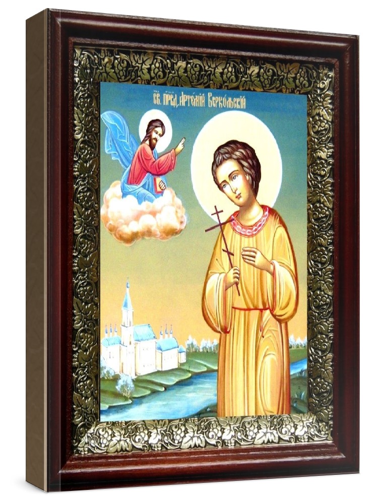 Икона артемий веркольский (19х22), темный киот. Лик нанесен методом шелкографии на цельную липовую доску, покрытую левкасом (специальным грунтом под живопись). Использованы минеральные (природные) краски. Размер иконы без киота (см): 13х16, с киотом: 19х22. Киот со стеклом, выполнен из березы и украшен басмой (узор из черненой меди в виде виноградной лозы). Икона освящена.