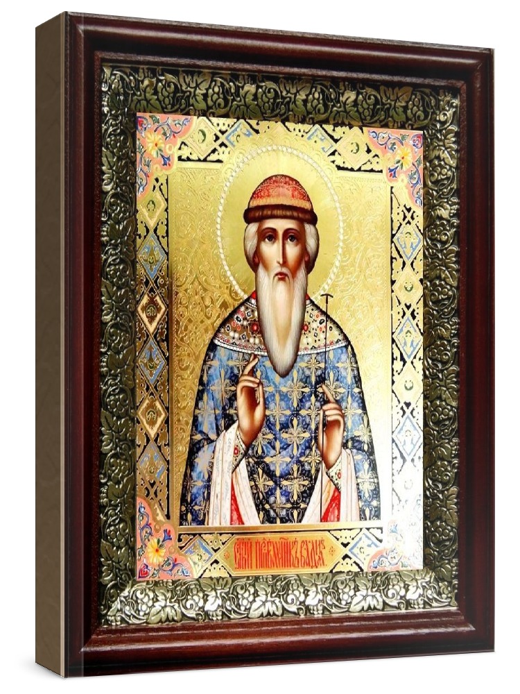 Икона вадим персидский (19х22), темный киот. Лик нанесен методом шелкографии на цельную липовую доску, покрытую левкасом (специальным грунтом под живопись). Использованы минеральные (природные) краски. Размер иконы без киота (см): 13х16, с киотом: 19х22. Киот со стеклом, выполнен из березы и украшен басмой (узор из черненой меди в виде виноградной лозы). Икона освящена.