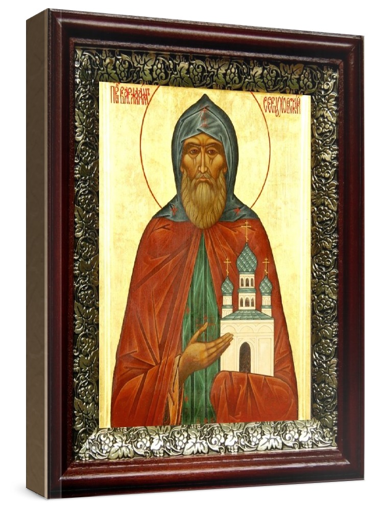 Икона варлаам серпуховской (19х22), темный киот. Лик нанесен методом шелкографии на цельную липовую доску, покрытую левкасом (специальным грунтом под живопись). Использованы минеральные (природные) краски. Размер иконы без киота (см): 13х16, с киотом: 19х22. Киот со стеклом, выполнен из березы и украшен басмой (узор из черненой меди в виде виноградной лозы). Икона освящена.