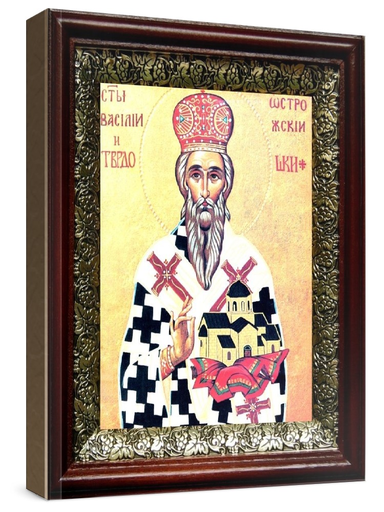 Икона василий острожский (19х22), темный киот. Лик нанесен методом шелкографии на цельную липовую доску, покрытую левкасом (специальным грунтом под живопись). Использованы минеральные (природные) краски. Размер иконы без киота (см): 13х16, с киотом: 19х22. Киот со стеклом, выполнен из березы и украшен басмой (узор из черненой меди в виде виноградной лозы). Икона освящена.