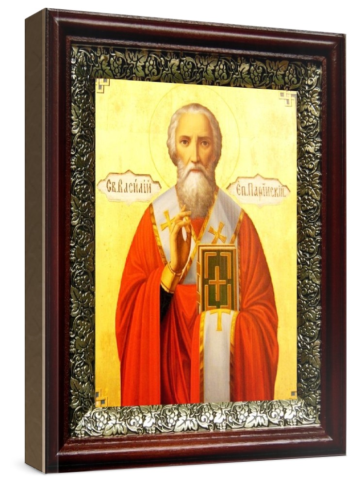 Икона василий парийский (19х22), темный киот. Лик нанесен методом шелкографии на цельную липовую доску, покрытую левкасом (специальным грунтом под живопись). Использованы минеральные (природные) краски. Размер иконы без киота (см): 13х16, с киотом: 19х22. Киот со стеклом, выполнен из березы и украшен басмой (узор из черненой меди в виде виноградной лозы). Икона освящена.