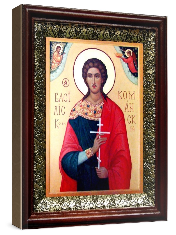 Икона василиск команский (19х22), темный киот. Лик нанесен методом шелкографии на цельную липовую доску, покрытую левкасом (специальным грунтом под живопись). Использованы минеральные (природные) краски. Размер иконы без киота (см): 13х16, с киотом: 19х22. Киот со стеклом, выполнен из березы и украшен басмой (узор из черненой меди в виде виноградной лозы). Икона освящена.
