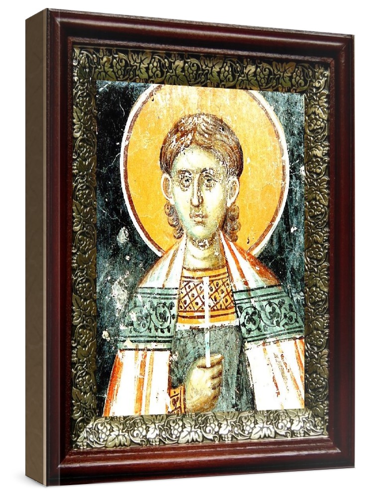 Икона вениамин персидский (19х22), темный киот. Лик нанесен методом шелкографии на цельную липовую доску, покрытую левкасом (специальным грунтом под живопись). Использованы минеральные (природные) краски. Размер иконы без киота (см): 13х16, с киотом: 19х22. Киот со стеклом, выполнен из березы и украшен басмой (узор из черненой меди в виде виноградной лозы). Икона освящена.