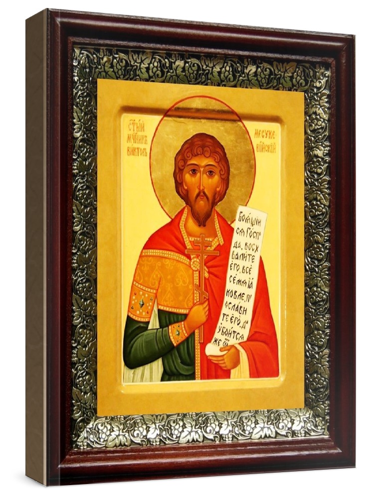 Икона виктор месукевийский (19х22), темный киот. Лик нанесен методом шелкографии на цельную липовую доску, покрытую левкасом (специальным грунтом под живопись). Использованы минеральные (природные) краски. Размер иконы без киота (см): 13х16, с киотом: 19х22. Киот со стеклом, выполнен из березы и украшен басмой (узор из черненой меди в виде виноградной лозы). Икона освящена.