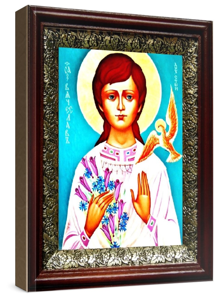 Икона вячеслав, отрок (19х22), темный киот. Лик нанесен методом шелкографии на цельную липовую доску, покрытую левкасом (специальным грунтом под живопись). Использованы минеральные (природные) краски. Размер иконы без киота (см): 13х16, с киотом: 19х22. Киот со стеклом, выполнен из березы и украшен басмой (узор из черненой меди в виде виноградной лозы). Икона освящена.