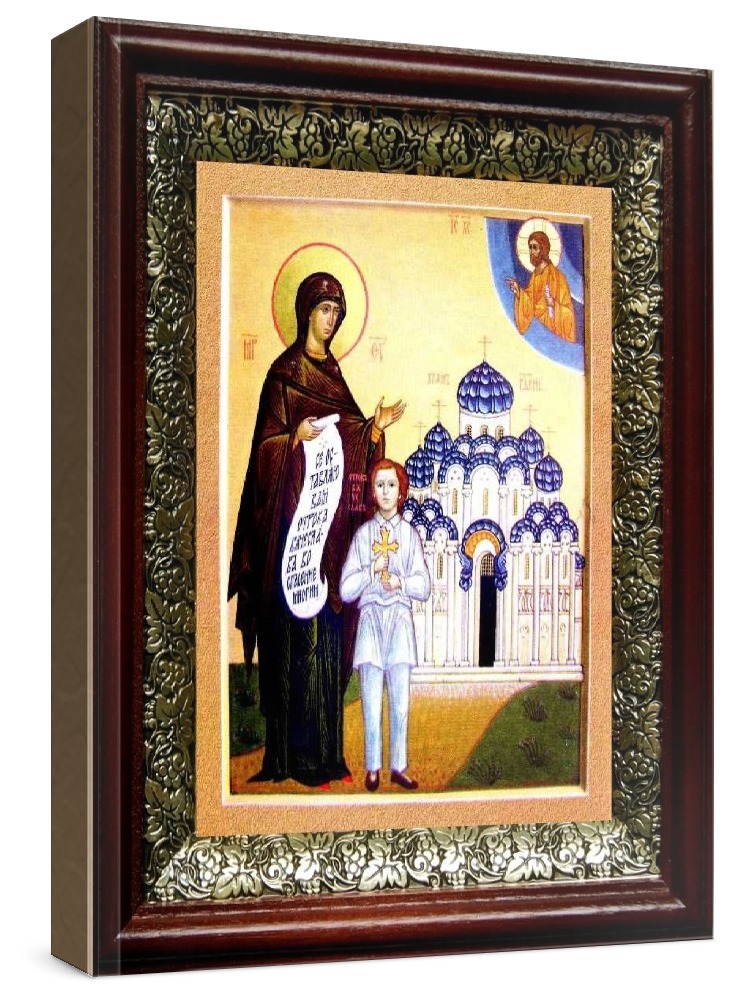 Икона вячеслав, отрок (19х22), темный киот. Лик нанесен методом шелкографии на цельную липовую доску, покрытую левкасом (специальным грунтом под живопись). Использованы минеральные (природные) краски. Размер иконы без киота (см): 13х16, с киотом: 19х22. Киот со стеклом, выполнен из березы и украшен басмой (узор из черненой меди в виде виноградной лозы). Икона освящена.
