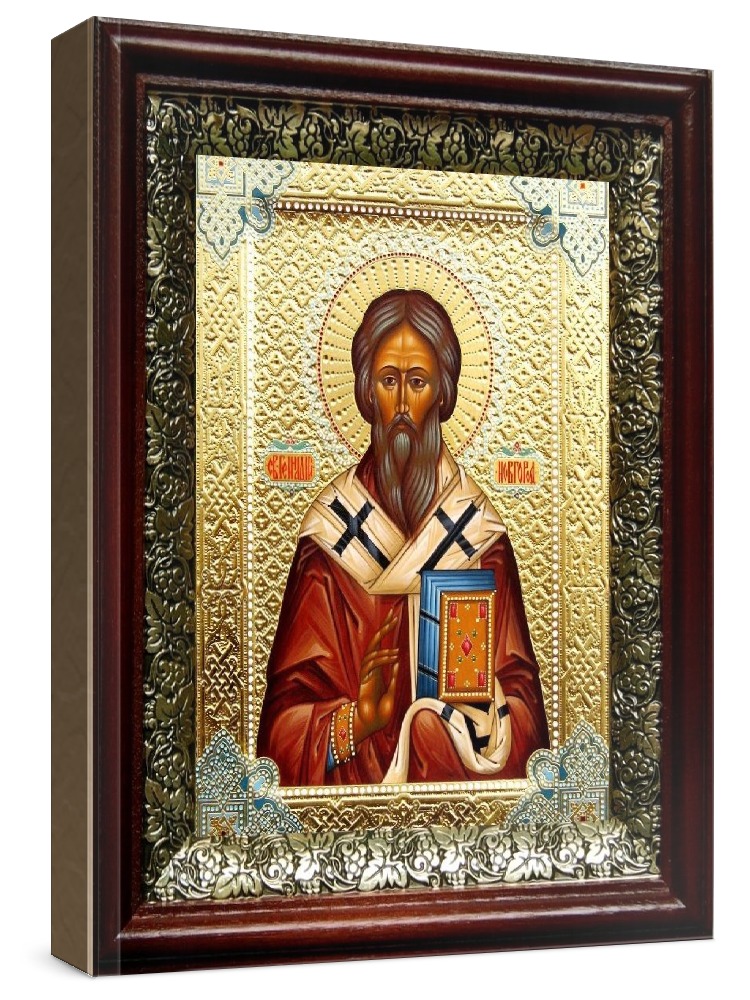 Икона геннадий новгородский (19х22), темный киот. Лик нанесен методом шелкографии на цельную липовую доску, покрытую левкасом (специальным грунтом под живопись). Использованы минеральные (природные) краски. Размер иконы без киота (см): 13х16, с киотом: 19х22. Киот со стеклом, выполнен из березы и украшен басмой (узор из черненой меди в виде виноградной лозы). Икона освящена.