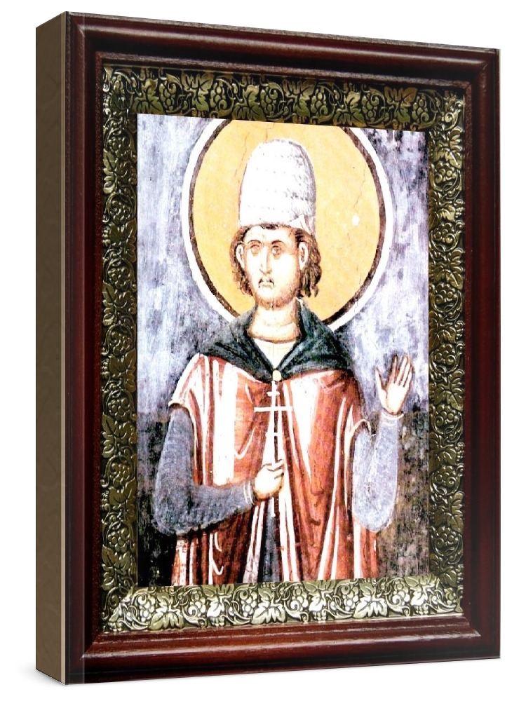 Икона георгий новый (19х22), темный киот. Лик нанесен методом шелкографии на цельную липовую доску, покрытую левкасом (специальным грунтом под живопись). Использованы минеральные (природные) краски. Размер иконы без киота (см): 13х16, с киотом: 19х22. Киот со стеклом, выполнен из березы и украшен басмой (узор из черненой меди в виде виноградной лозы). Икона освящена.