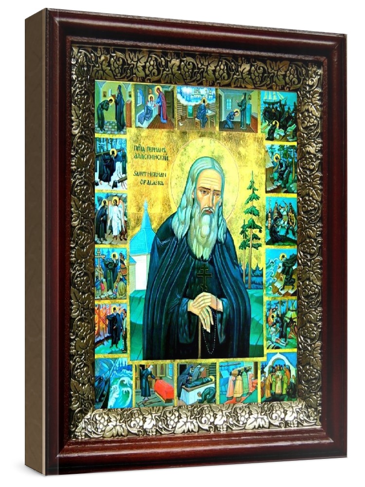 Икона герман аляскинский (19х22), темный киот. Лик нанесен методом шелкографии на цельную липовую доску, покрытую левкасом (специальным грунтом под живопись). Использованы минеральные (природные) краски. Размер иконы без киота (см): 13х16, с киотом: 19х22. Киот со стеклом, выполнен из березы и украшен басмой (узор из черненой меди в виде виноградной лозы). Икона освящена.