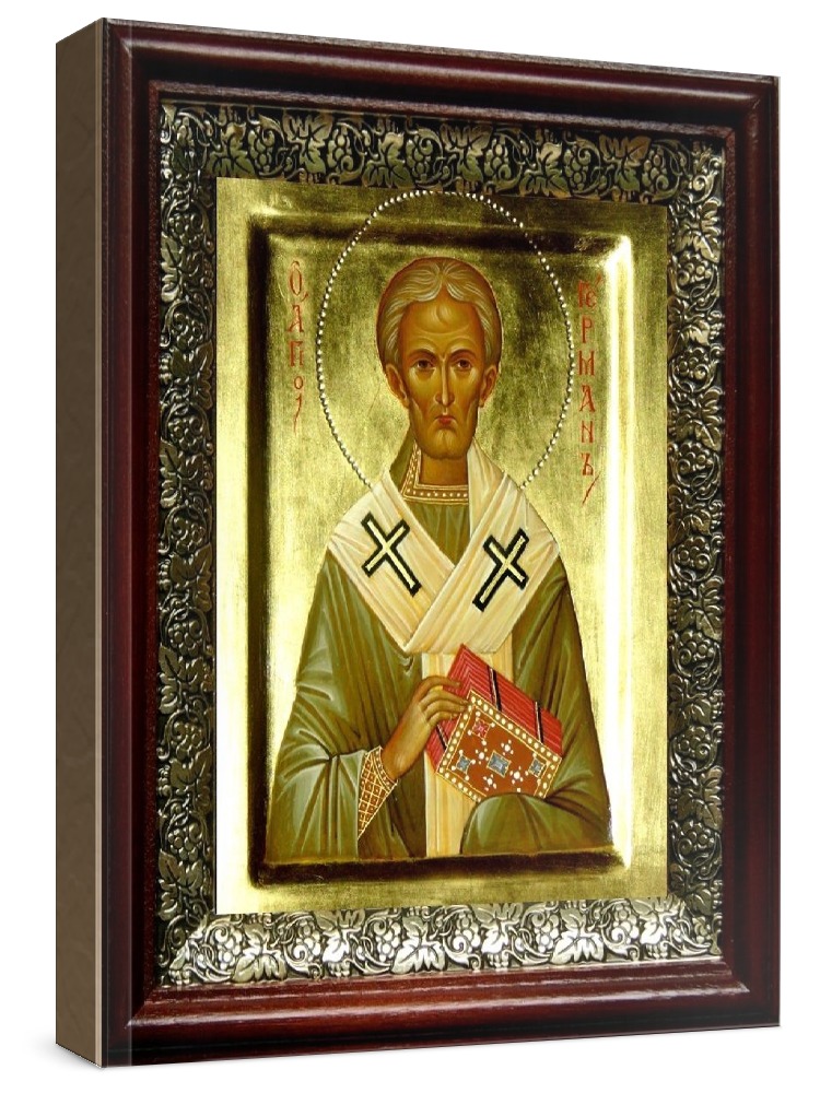 Икона герман константинопольский (19х22), темный киот. Лик нанесен методом шелкографии на цельную липовую доску, покрытую левкасом (специальным грунтом под живопись). Использованы минеральные (природные) краски. Размер иконы без киота (см): 13х16, с киотом: 19х22. Киот со стеклом, выполнен из березы и украшен басмой (узор из черненой меди в виде виноградной лозы). Икона освящена.