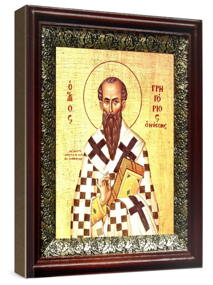 Икона григорий нисский (19х22), темный киот. Лик нанесен методом шелкографии на цельную липовую доску, покрытую левкасом (специальным грунтом под живопись). Использованы минеральные (природные) краски. Размер иконы без киота (см): 13х16, с киотом: 19х22. Киот со стеклом, выполнен из березы и украшен басмой (узор из черненой меди в виде виноградной лозы). Икона освящена.