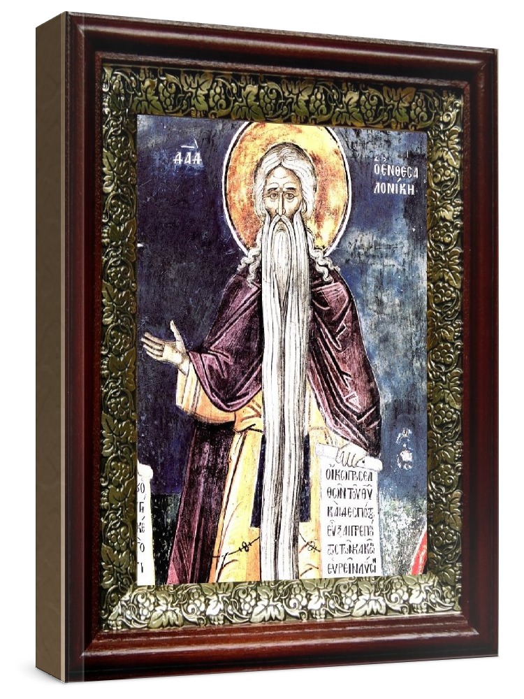 Икона давид солунский (19х22), темный киот. Лик нанесен методом шелкографии на цельную липовую доску, покрытую левкасом (специальным грунтом под живопись). Использованы минеральные (природные) краски. Размер иконы без киота (см): 13х16, с киотом: 19х22. Киот со стеклом, выполнен из березы и украшен басмой (узор из черненой меди в виде виноградной лозы). Икона освящена.