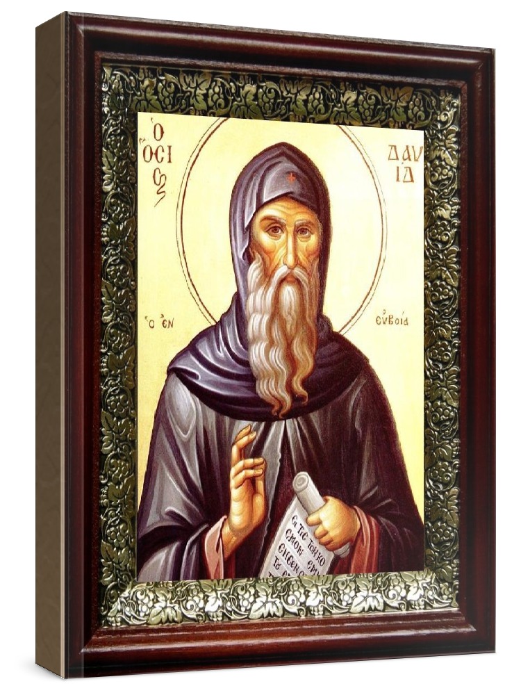 Икона давид эвбейский (19х22), темный киот. Лик нанесен методом шелкографии на цельную липовую доску, покрытую левкасом (специальным грунтом под живопись). Использованы минеральные (природные) краски. Размер иконы без киота (см): 13х16, с киотом: 19х22. Киот со стеклом, выполнен из березы и украшен басмой (узор из черненой меди в виде виноградной лозы). Икона освящена.