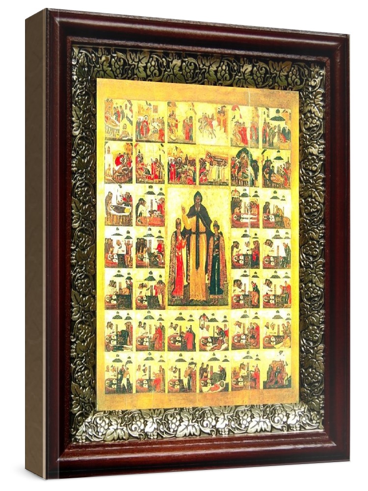 Икона давид ярославский (19х22), темный киот. Лик нанесен методом шелкографии на цельную липовую доску, покрытую левкасом (специальным грунтом под живопись). Использованы минеральные (природные) краски. Размер иконы без киота (см): 13х16, с киотом: 19х22. Киот со стеклом, выполнен из березы и украшен басмой (узор из черненой меди в виде виноградной лозы). Икона освящена.
