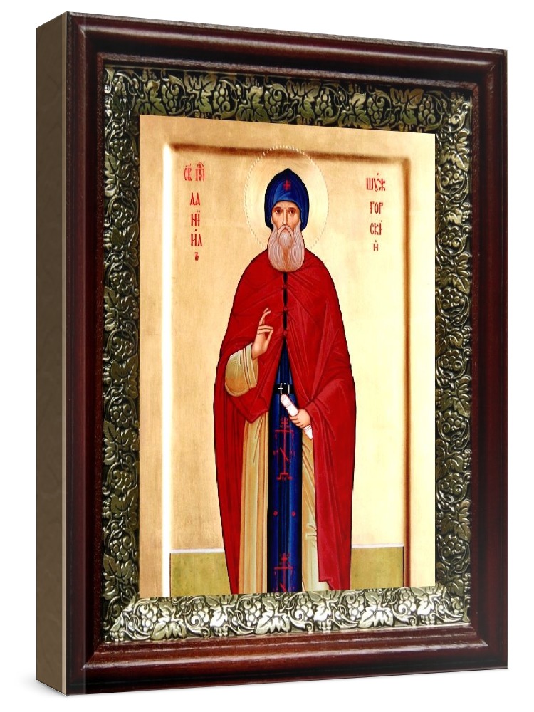 Икона даниил шужгорский (19х22), темный киот. Лик нанесен методом шелкографии на цельную липовую доску, покрытую левкасом (специальным грунтом под живопись). Использованы минеральные (природные) краски. Размер иконы без киота (см): 13х16, с киотом: 19х22. Киот со стеклом, выполнен из березы и украшен басмой (узор из черненой меди в виде виноградной лозы). Икона освящена.