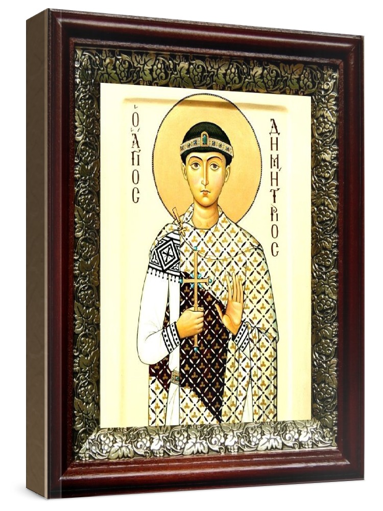 Икона димитрий солунский (19х22), темный киот. Лик нанесен методом шелкографии на цельную липовую доску, покрытую левкасом (специальным грунтом под живопись). Использованы минеральные (природные) краски. Размер иконы без киота (см): 13х16, с киотом: 19х22. Киот со стеклом, выполнен из березы и украшен басмой (узор из черненой меди в виде виноградной лозы). Икона освящена.