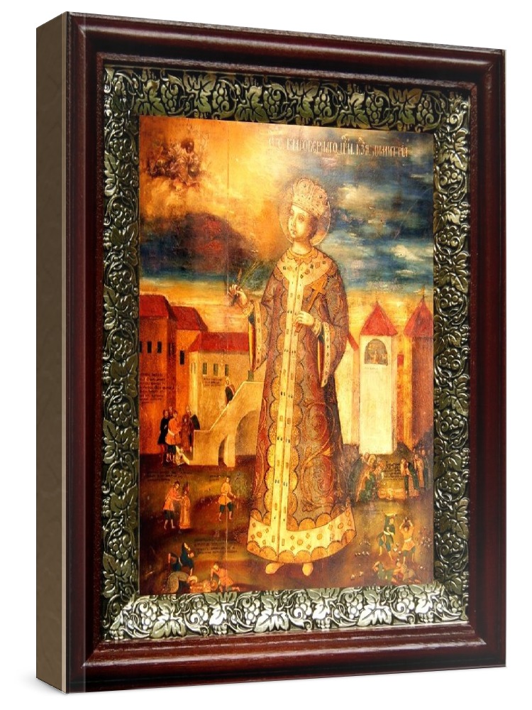 Икона димитрий угличский (19х22), темный киот. Лик нанесен методом шелкографии на цельную липовую доску, покрытую левкасом (специальным грунтом под живопись). Использованы минеральные (природные) краски. Размер иконы без киота (см): 13х16, с киотом: 19х22. Киот со стеклом, выполнен из березы и украшен басмой (узор из черненой меди в виде виноградной лозы). Икона освящена.