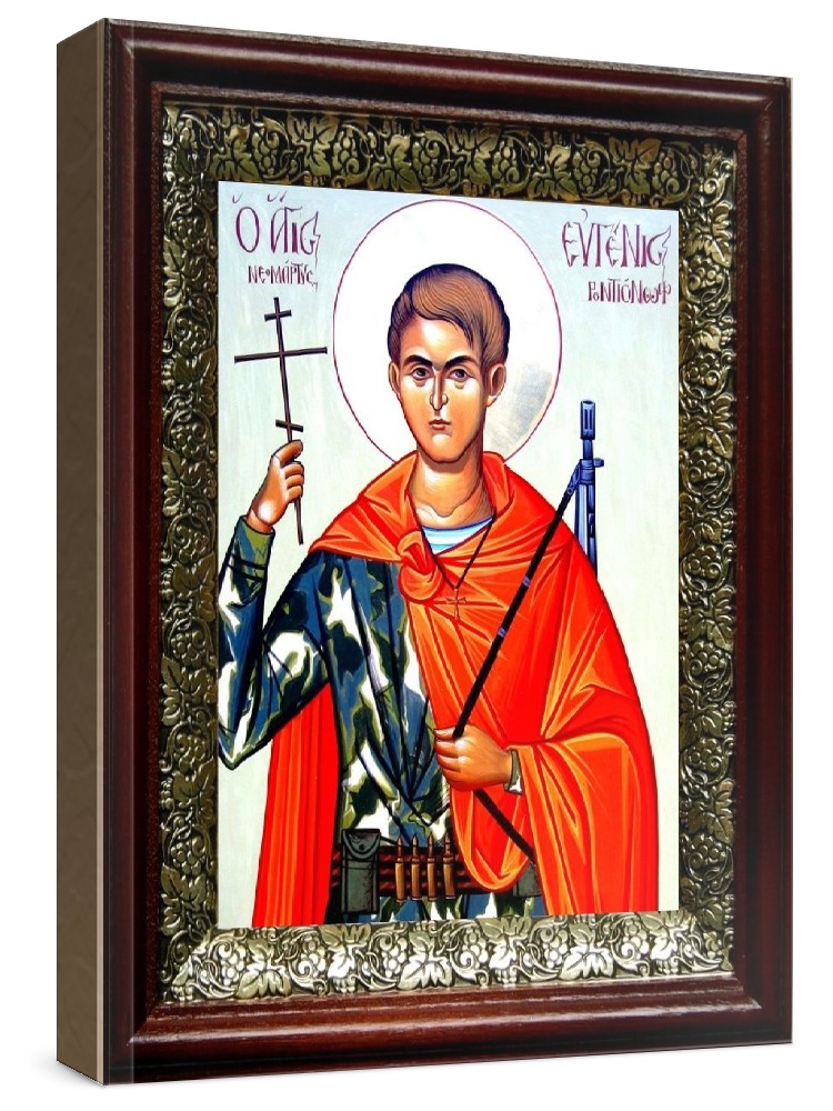 Икона евгений родионов (19х22), темный киот. Лик нанесен методом шелкографии на цельную липовую доску, покрытую левкасом (специальным грунтом под живопись). Использованы минеральные (природные) краски. Размер иконы без киота (см): 13х16, с киотом: 19х22. Киот со стеклом, выполнен из березы и украшен басмой (узор из черненой меди в виде виноградной лозы). Икона освящена.
