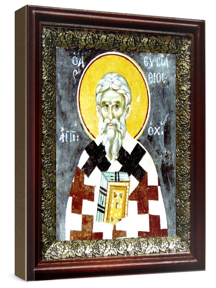 Икона евстафий антиохийский (19х22), темный киот. Лик нанесен методом шелкографии на цельную липовую доску, покрытую левкасом (специальным грунтом под живопись). Использованы минеральные (природные) краски. Размер иконы без киота (см): 13х16, с киотом: 19х22. Киот со стеклом, выполнен из березы и украшен басмой (узор из черненой меди в виде виноградной лозы). Икона освящена.