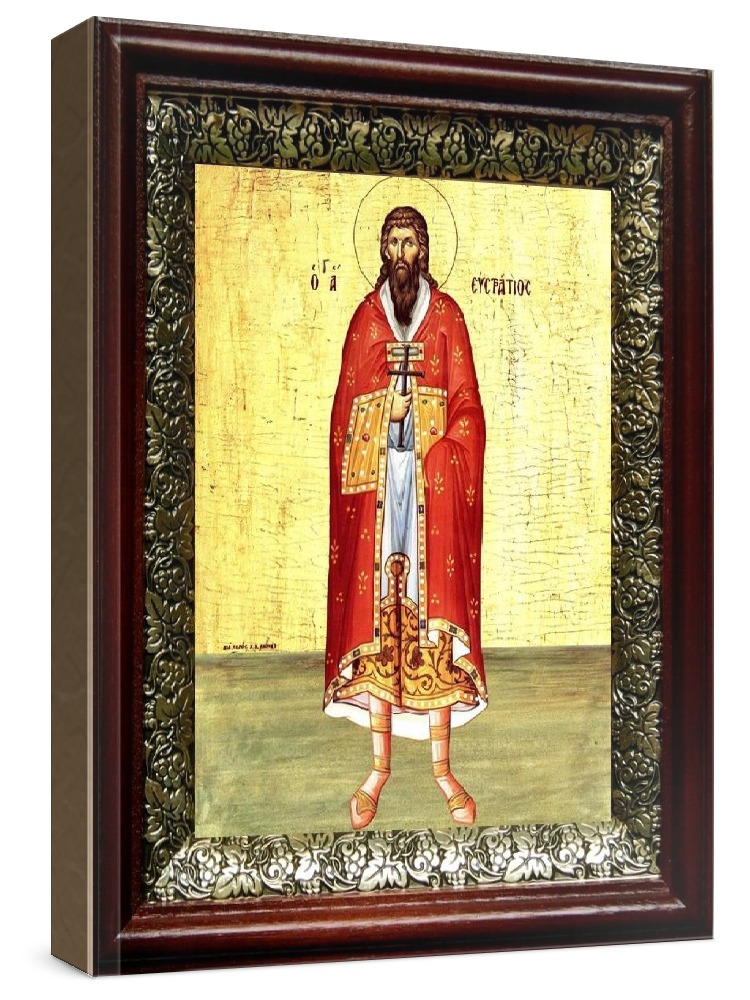 Икона евстратий севастийский (19х22), темный киот. Лик нанесен методом шелкографии на цельную липовую доску, покрытую левкасом (специальным грунтом под живопись). Использованы минеральные (природные) краски. Размер иконы без киота (см): 13х16, с киотом: 19х22. Киот со стеклом, выполнен из березы и украшен басмой (узор из черненой меди в виде виноградной лозы). Икона освящена.