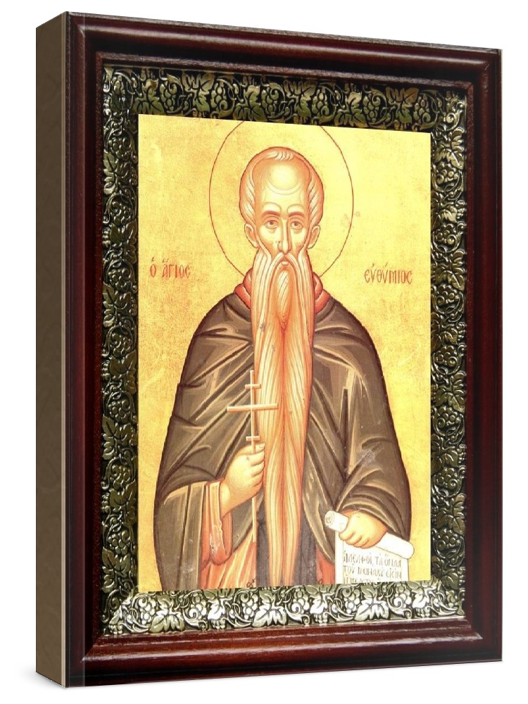 Икона евфимий великий (19х22), темный киот. Лик нанесен методом шелкографии на цельную липовую доску, покрытую левкасом (специальным грунтом под живопись). Использованы минеральные (природные) краски. Размер иконы без киота (см): 13х16, с киотом: 19х22. Киот со стеклом, выполнен из березы и украшен басмой (узор из черненой меди в виде виноградной лозы). Икона освящена.