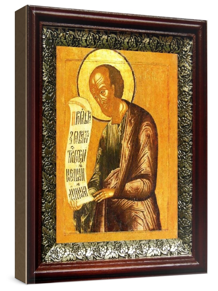 Икона елисей, пророк (19х22), темный киот. Лик нанесен методом шелкографии на цельную липовую доску, покрытую левкасом (специальным грунтом под живопись). Использованы минеральные (природные) краски. Размер иконы без киота (см): 13х16, с киотом: 19х22. Киот со стеклом, выполнен из березы и украшен басмой (узор из черненой меди в виде виноградной лозы). Икона освящена.