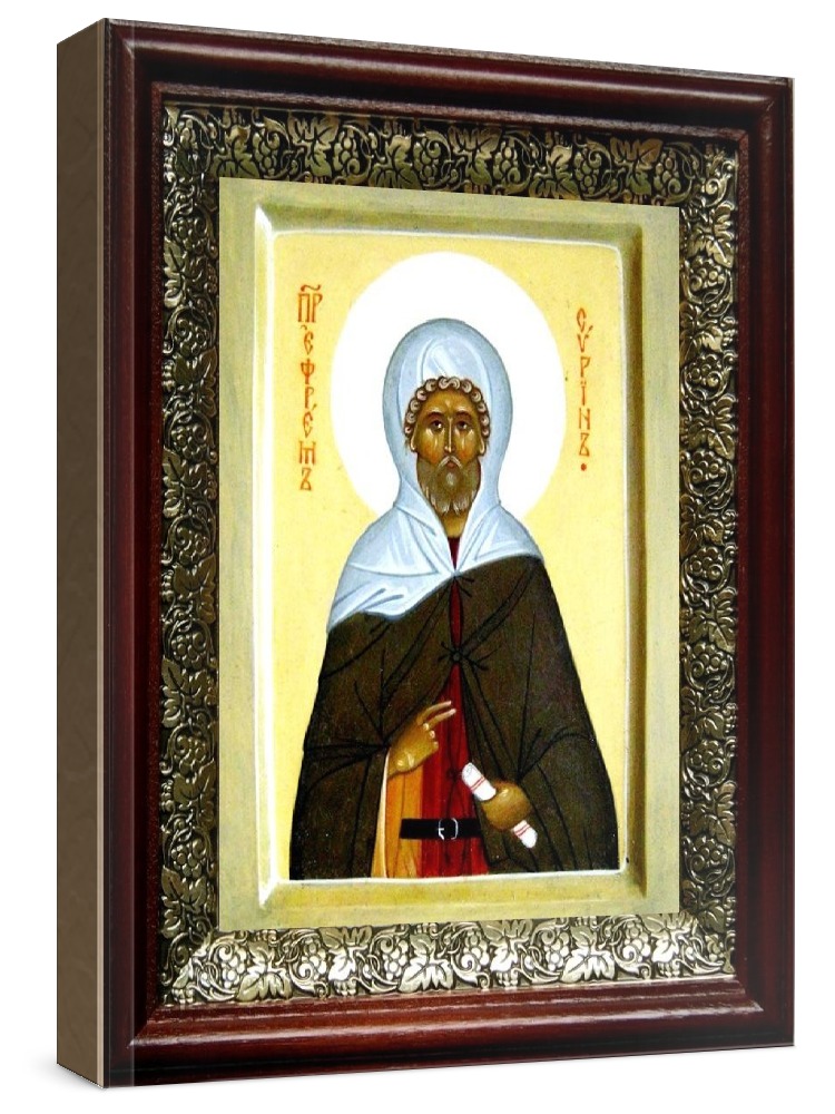 Икона ефрем сирин (19х22), темный киот. Лик нанесен методом шелкографии на цельную липовую доску, покрытую левкасом (специальным грунтом под живопись). Использованы минеральные (природные) краски. Размер иконы без киота (см): 13х16, с киотом: 19х22. Киот со стеклом, выполнен из березы и украшен басмой (узор из черненой меди в виде виноградной лозы). Икона освящена.