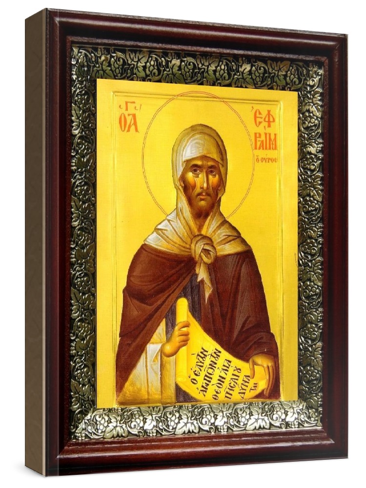 Икона ефрем сирин (19х22), темный киот. Лик нанесен методом шелкографии на цельную липовую доску, покрытую левкасом (специальным грунтом под живопись). Использованы минеральные (природные) краски. Размер иконы без киота (см): 13х16, с киотом: 19х22. Киот со стеклом, выполнен из березы и украшен басмой (узор из черненой меди в виде виноградной лозы). Икона освящена.