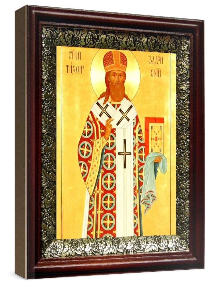 Икона тихон задонский (19х22), темный киот. Лик нанесен методом шелкографии на цельную липовую доску, покрытую левкасом (специальным грунтом под живопись). Использованы минеральные (природные) краски. Размер иконы без киота (см): 13х16, с киотом: 19х22. Киот со стеклом, выполнен из березы и украшен басмой (узор из черненой меди в виде виноградной лозы). Икона освящена.