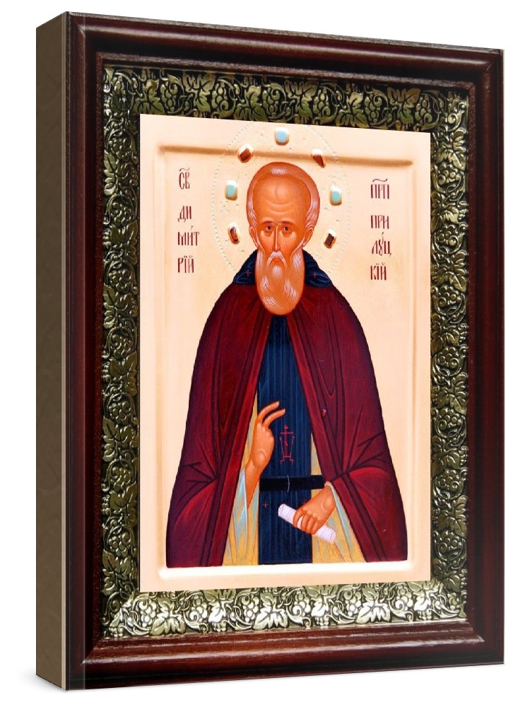 Икона димитрий прилуцкий (19х22), темный киот. Лик нанесен методом шелкографии на цельную липовую доску, покрытую левкасом (специальным грунтом под живопись). Использованы минеральные (природные) краски. Размер иконы без киота (см): 13х16, с киотом: 19х22. Киот со стеклом, выполнен из березы и украшен басмой (узор из черненой меди в виде виноградной лозы). Икона освящена.