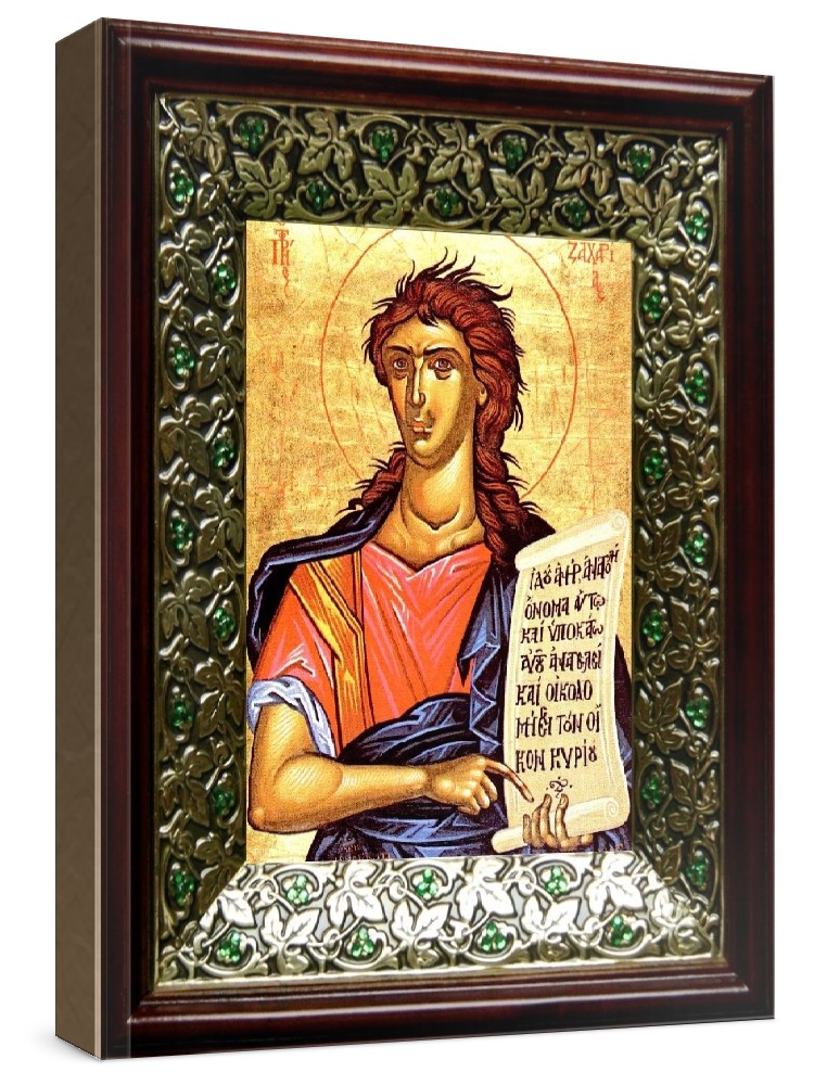 Икона захария серповидец (19х22), темный киот. Лик нанесен методом шелкографии на цельную липовую доску, покрытую левкасом (специальным грунтом под живопись). Использованы минеральные (природные) краски. Размер иконы без киота (см): 13х16, с киотом: 19х22. Киот со стеклом, выполнен из березы и украшен басмой (узор из черненой меди в виде виноградной лозы). Икона освящена.