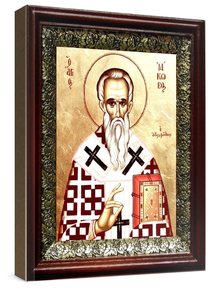 Икона иаков, брат господень (19х22), темный киот. Лик нанесен методом шелкографии на цельную липовую доску, покрытую левкасом (специальным грунтом под живопись). Использованы минеральные (природные) краски. Размер иконы без киота (см): 13х16, с киотом: 19х22. Киот со стеклом, выполнен из березы и украшен басмой (узор из черненой меди в виде виноградной лозы). Икона освящена.