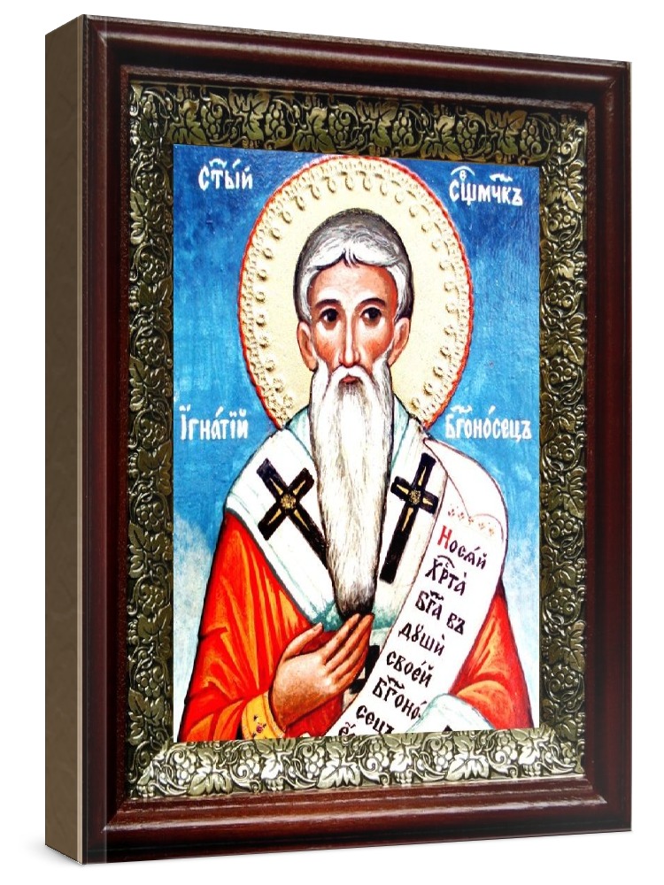 Икона игнатий богоносец (19х22), темный киот. Лик нанесен методом шелкографии на цельную липовую доску, покрытую левкасом (специальным грунтом под живопись). Использованы минеральные (природные) краски. Размер иконы без киота (см): 13х16, с киотом: 19х22. Киот со стеклом, выполнен из березы и украшен басмой (узор из черненой меди в виде виноградной лозы). Икона освящена.