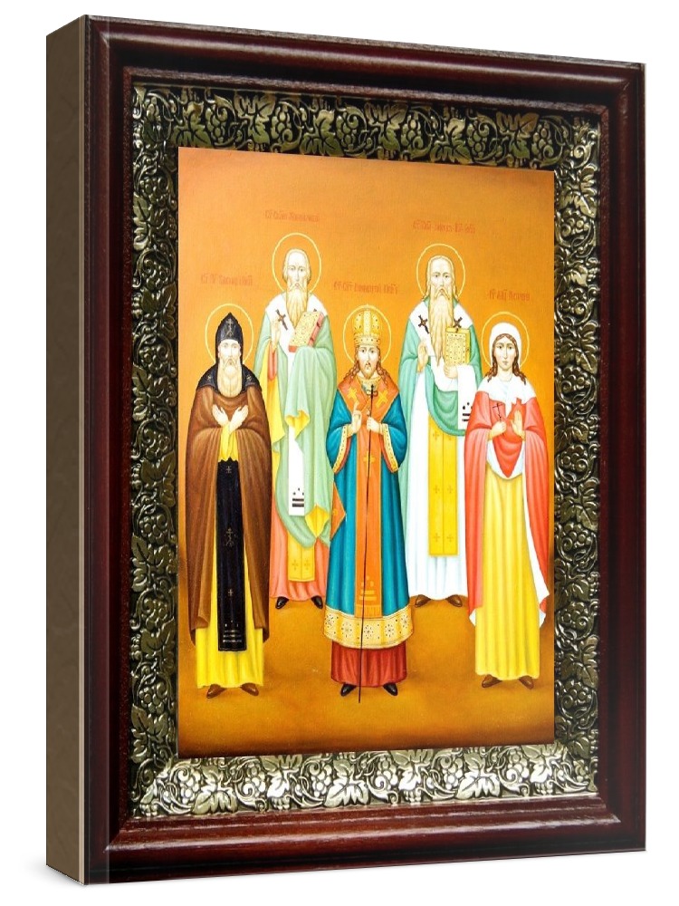 Икона василий, харлампий, акилина и иннокентий пензенский (19х22), темный . Лик нанесен методом шелкографии на цельную липовую доску, покрытую левкасом (специальным грунтом под живопись). Использованы минеральные (природные) краски. Размер иконы без киота (см): 13х16, с киотом: 19х22. Киот со стеклом, выполнен из березы и украшен басмой (узор из черненой меди в виде виноградной лозы). Икона освящена.