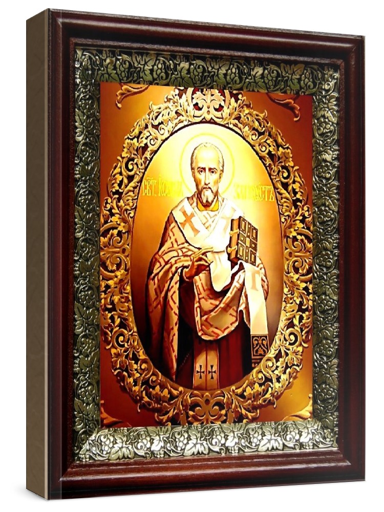 Икона иоанн константинопольский (19х22), темный киот. Лик нанесен методом шелкографии на цельную липовую доску, покрытую левкасом (специальным грунтом под живопись). Использованы минеральные (природные) краски. Размер иконы без киота (см): 13х16, с киотом: 19х22. Киот со стеклом, выполнен из березы и украшен басмой (узор из черненой меди в виде виноградной лозы). Икона освящена.