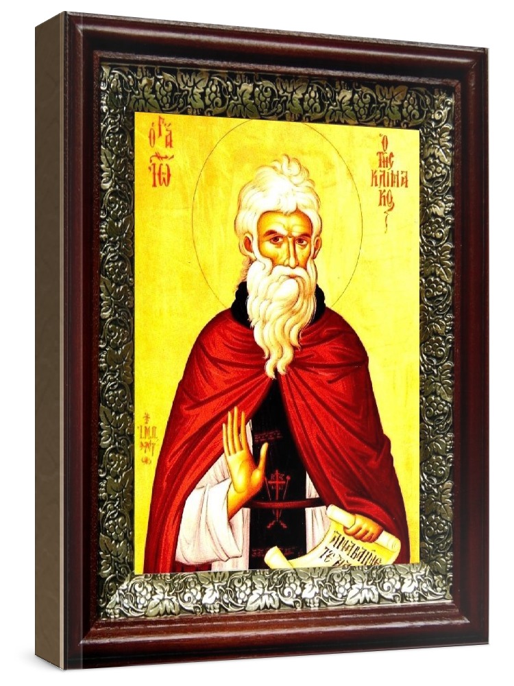 Икона иоанн лествичник (19х22), темный киот. Лик нанесен методом шелкографии на цельную липовую доску, покрытую левкасом (специальным грунтом под живопись). Использованы минеральные (природные) краски. Размер иконы без киота (см): 13х16, с киотом: 19х22. Киот со стеклом, выполнен из березы и украшен басмой (узор из черненой меди в виде виноградной лозы). Икона освящена.