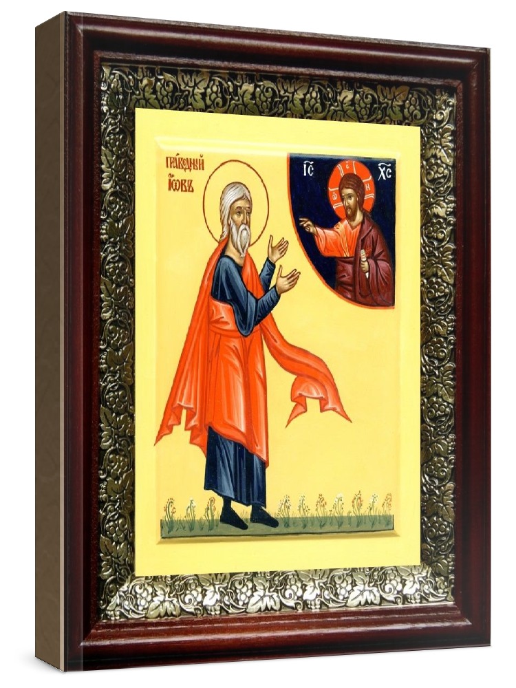 Икона иов многострадальный (19х22), темный киот. Лик нанесен методом шелкографии на цельную липовую доску, покрытую левкасом (специальным грунтом под живопись). Использованы минеральные (природные) краски. Размер иконы без киота (см): 13х16, с киотом: 19х22. Киот со стеклом, выполнен из березы и украшен басмой (узор из черненой меди в виде виноградной лозы). Икона освящена.